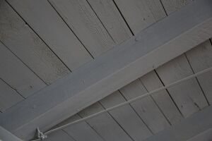 hellgrauer Anstrich. Nut und Kamm / Feder Verbindung. Breiten der Bretter 7-13cm Gesamte Anzahl m2: 4.500m2 | |