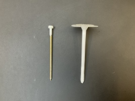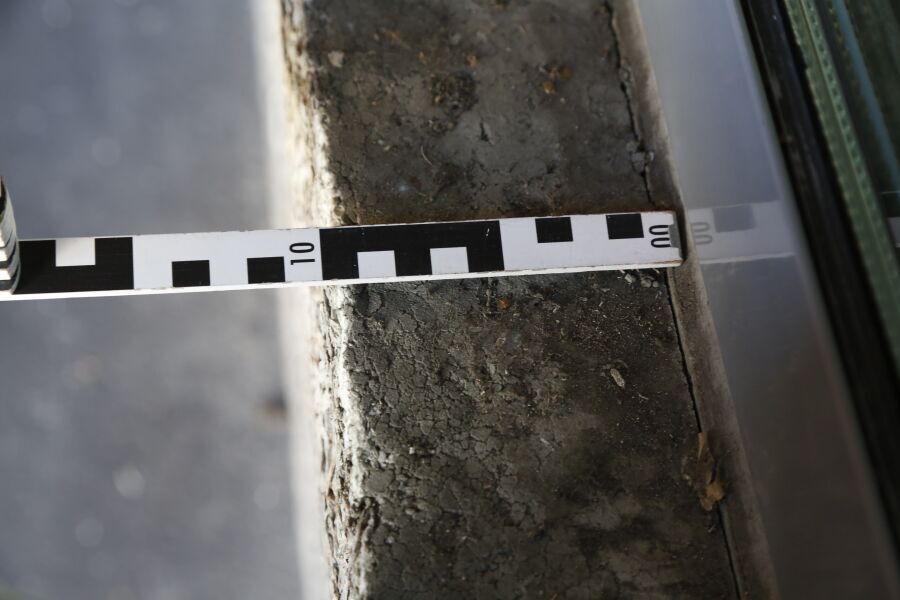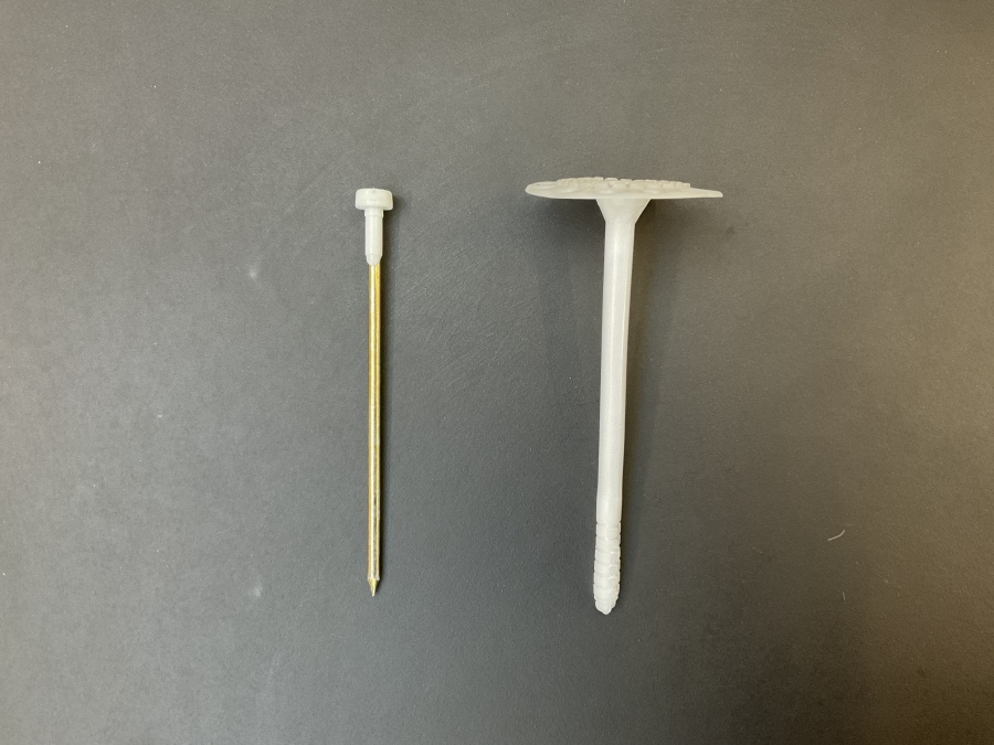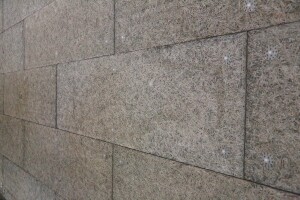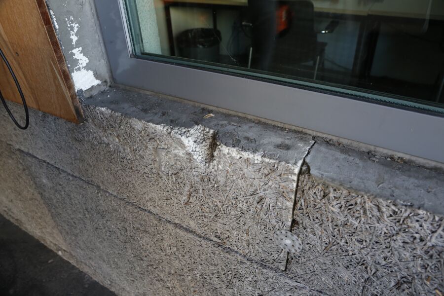 Kaschiert mit zementgebundener Holzwolle. Befestigt mit Kunststoffdübeln. Im Bereich der sondierten Platte nicht verklebt, jedoch sind Kunststoffschlagdübel nur schwer zu entfernen. Im Demontageversuch mit Locheisen nicht möglich. 1997. | |
