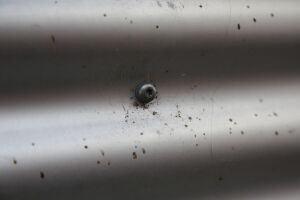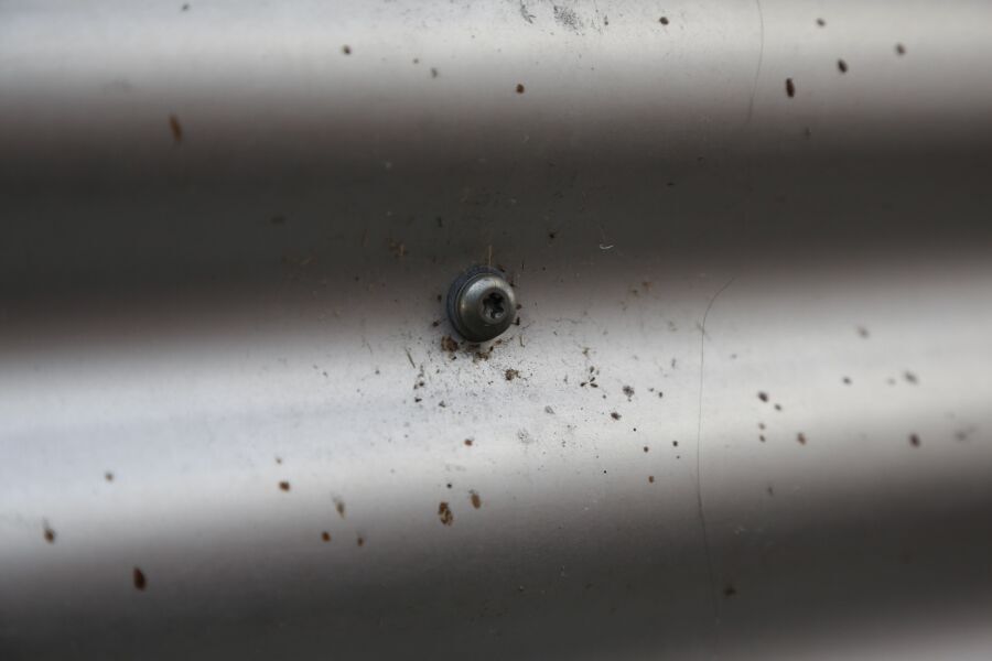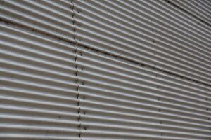 Horizontal eingebaut. Welle 7.5cm breit. Wiederverwendung von Fassadenblech sehr gut möglich. Rückseite ebenfalls Alumium roh. | |