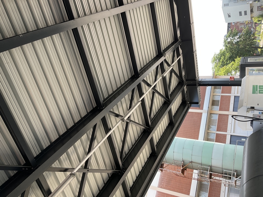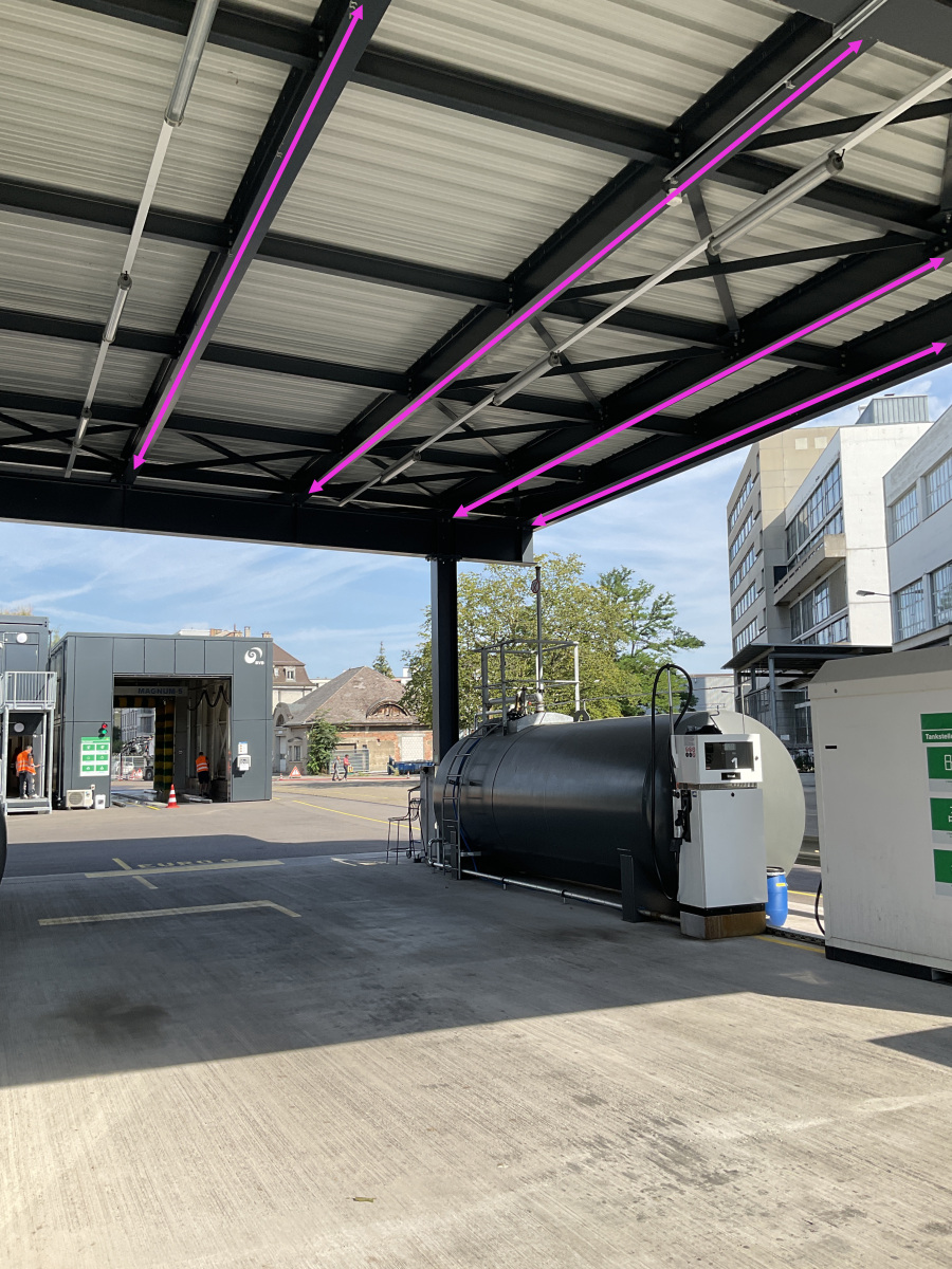| Beschreibung | Stahlträger IPE 400 S235, Oberflansch einseitig durchlöchert, bei vier Elementen angeschweisste Befestigung der Aussteifung. Beschichtet, RAL 7016. Plangrundlage Bestand siehe Minenbeschrieb.